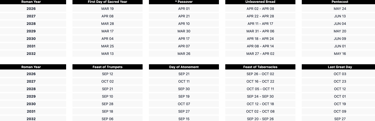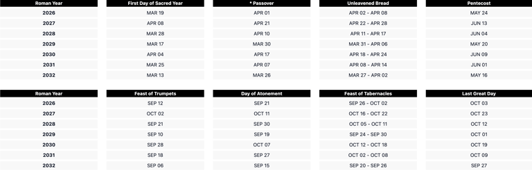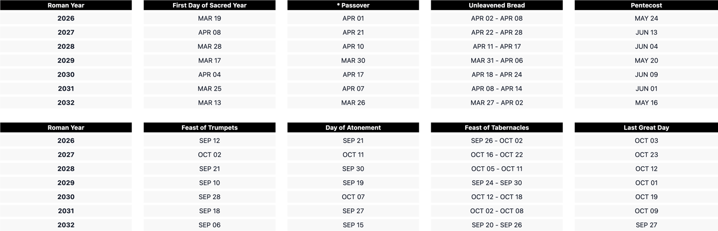 Note: Sabbaths & Holy Days begin the previous day at sunset, and end at sunset on the above dates. Passover is to be held "between the two evenings". This means the ceremony should begin just after sunset (and before it becomes dark) at the end of the previous day to the date shown above.